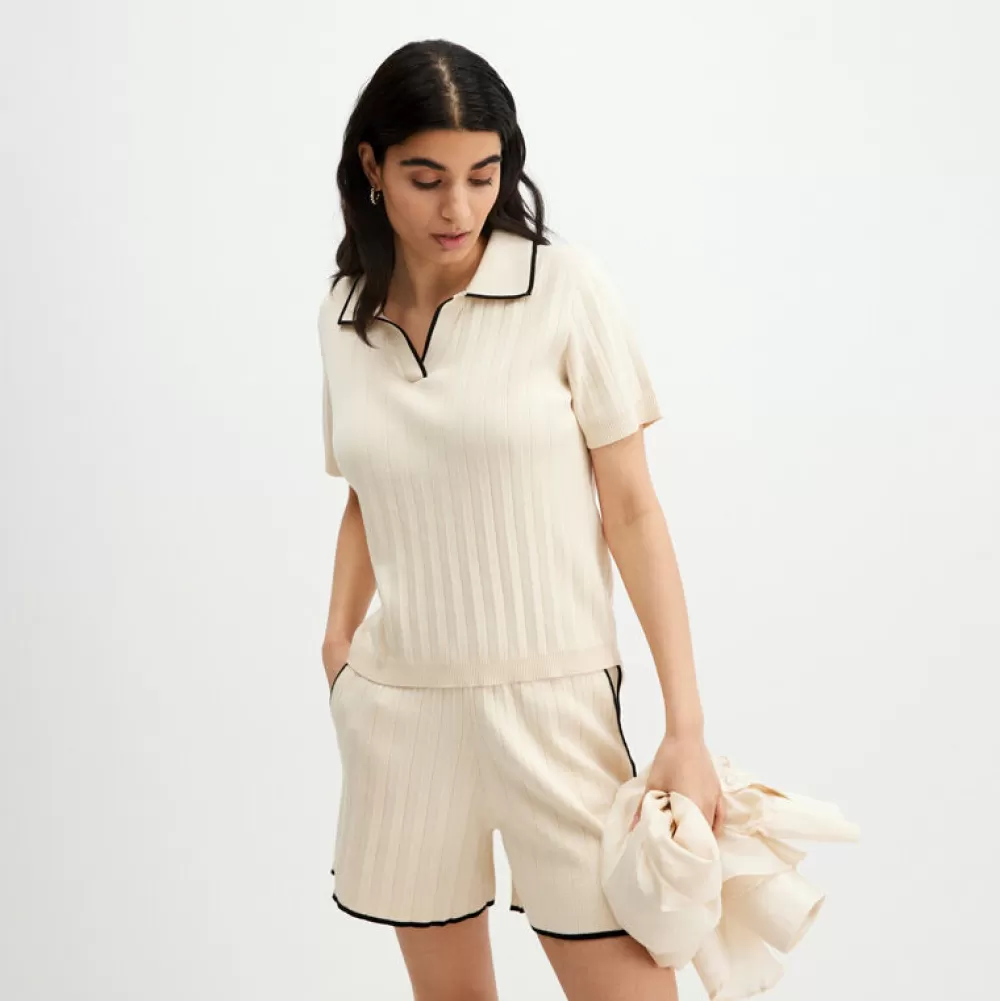 Tidløs, strikket, kortermet overdel til dame med lett plissert struktur i økologisk bomull og Tencel™ Lyocell. Plagget har flatterende, rett passform med korte ermer og piquet-krage med kontrastdetaljer. Overdelen kan styles med matchende shorts.