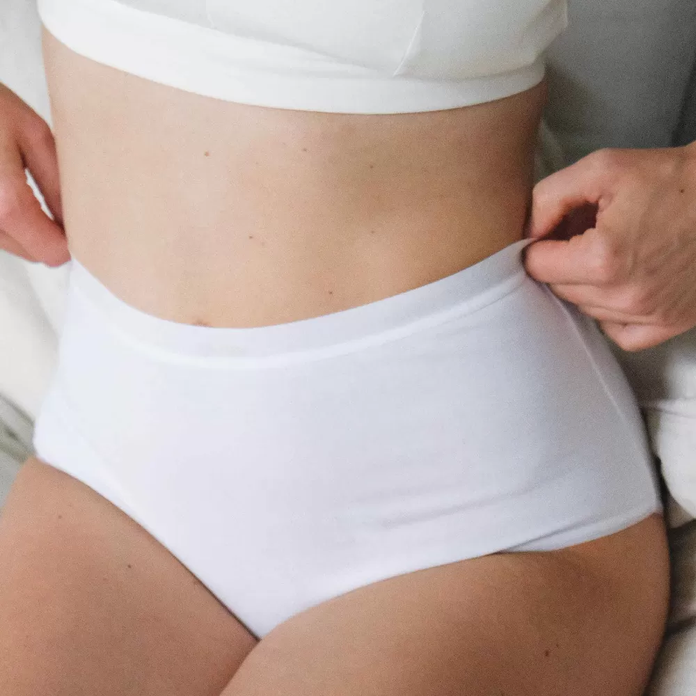 High waist-truse i myk økologisk bomull. Denne modellen har et høyt liv, spesialtilpasset klær som sitter i midjen. Dette gjør den ekstra komfortabel, og gir en fin, jevn linje. Passer også godt til rette kjoler som faller over hoftene uten markert liv.